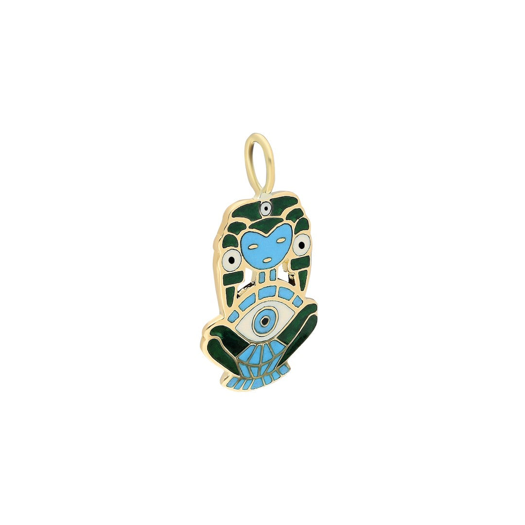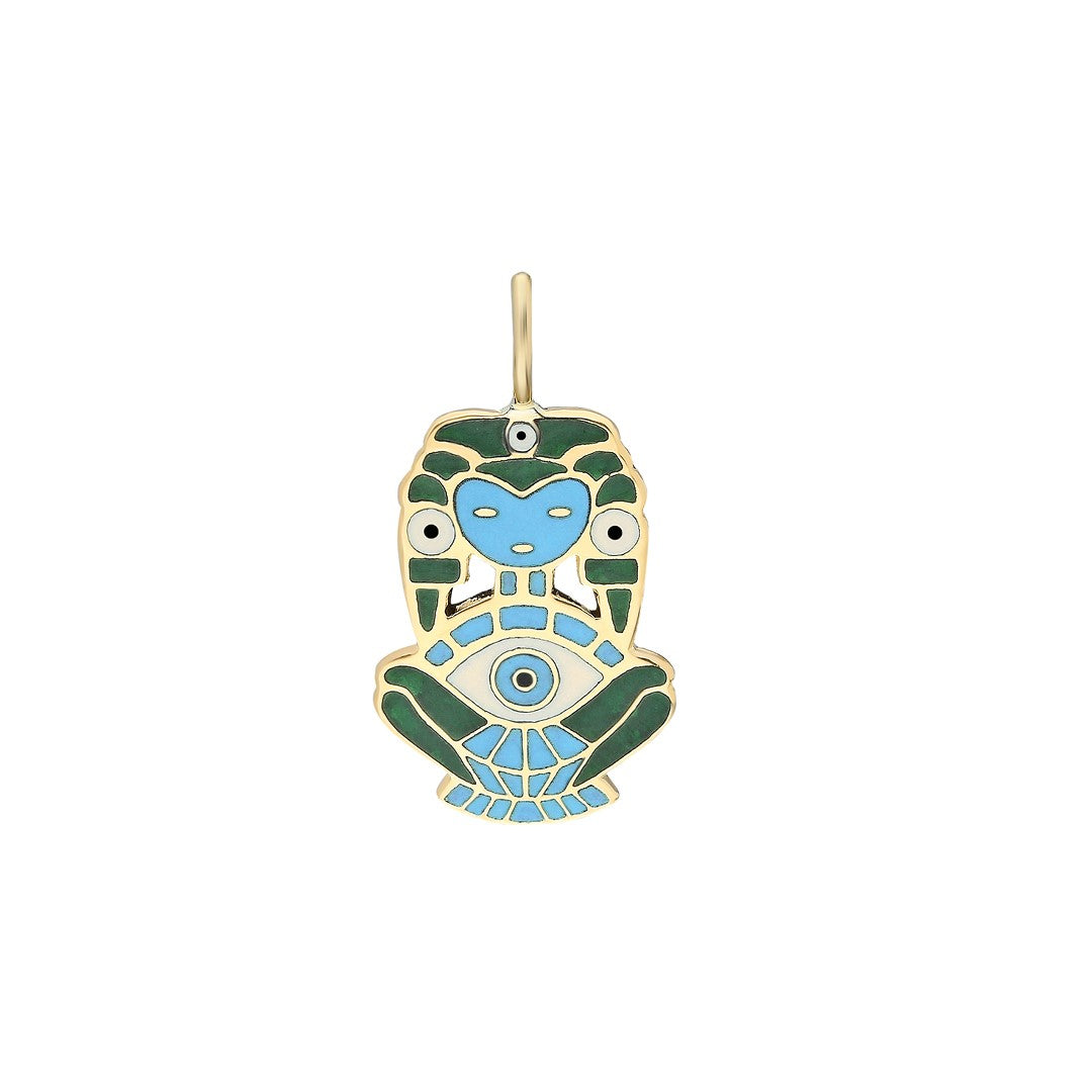 We’ve also added a touch of Turkish design to this Caribbean Taíno queen. A nazar boncuk—the famed Turkish “evil eye” and ultimate symbol of protection—sits in her lap, in the shelter of her arms.