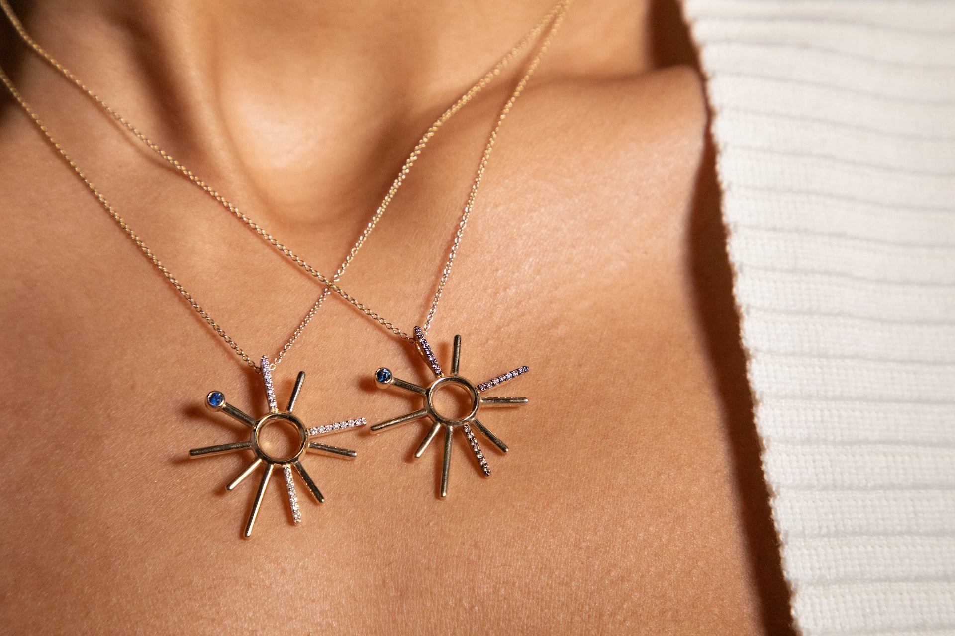 A familiar greeting all over the world. Our sun makes reference to a famous petroglyph our Taíno ancestors left behind. Sporadic rays are like exclamation marks that celebrate a new day, shimmering with rhodium-backed cognac diamonds and reaching for the sky with one deep blue sapphire.