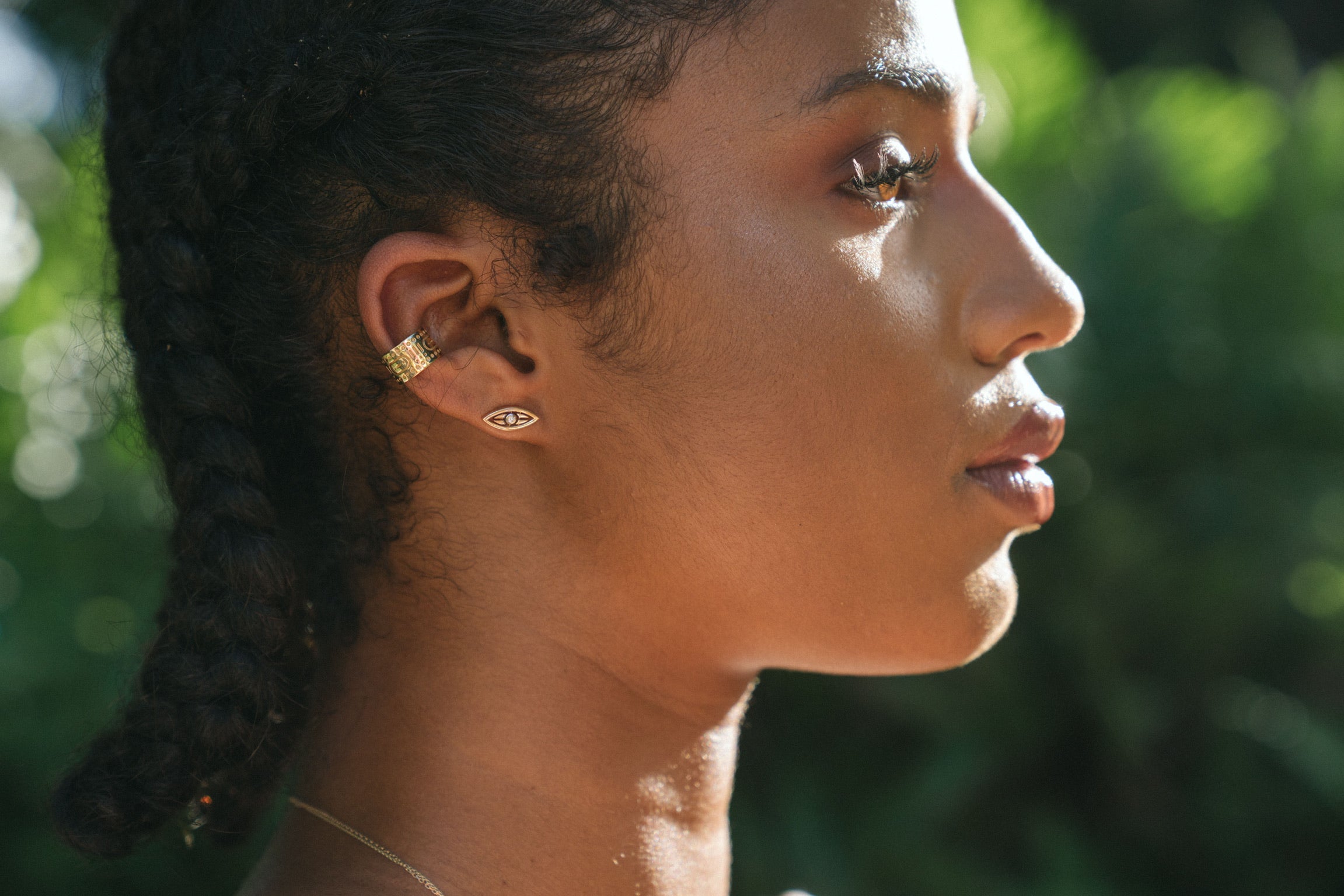 Our Turkish heritage meant we would eventually find an eye of protection across the Atlantic. Macu twinkles with one white diamond and is cut out of 14K gold from a combination of patterns carved in caves, pottery and sacred Taíno objects, designed to create a new evil eye, with a nod to art deco.