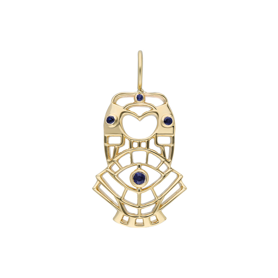 Turkish design adds another element of protection to this powerful and multi-versed deity. A nazar boncuk—the famed Turkish “evil eye”—sits in her lap, in the shelter of her arms, protecting her womb…the chamber of life.