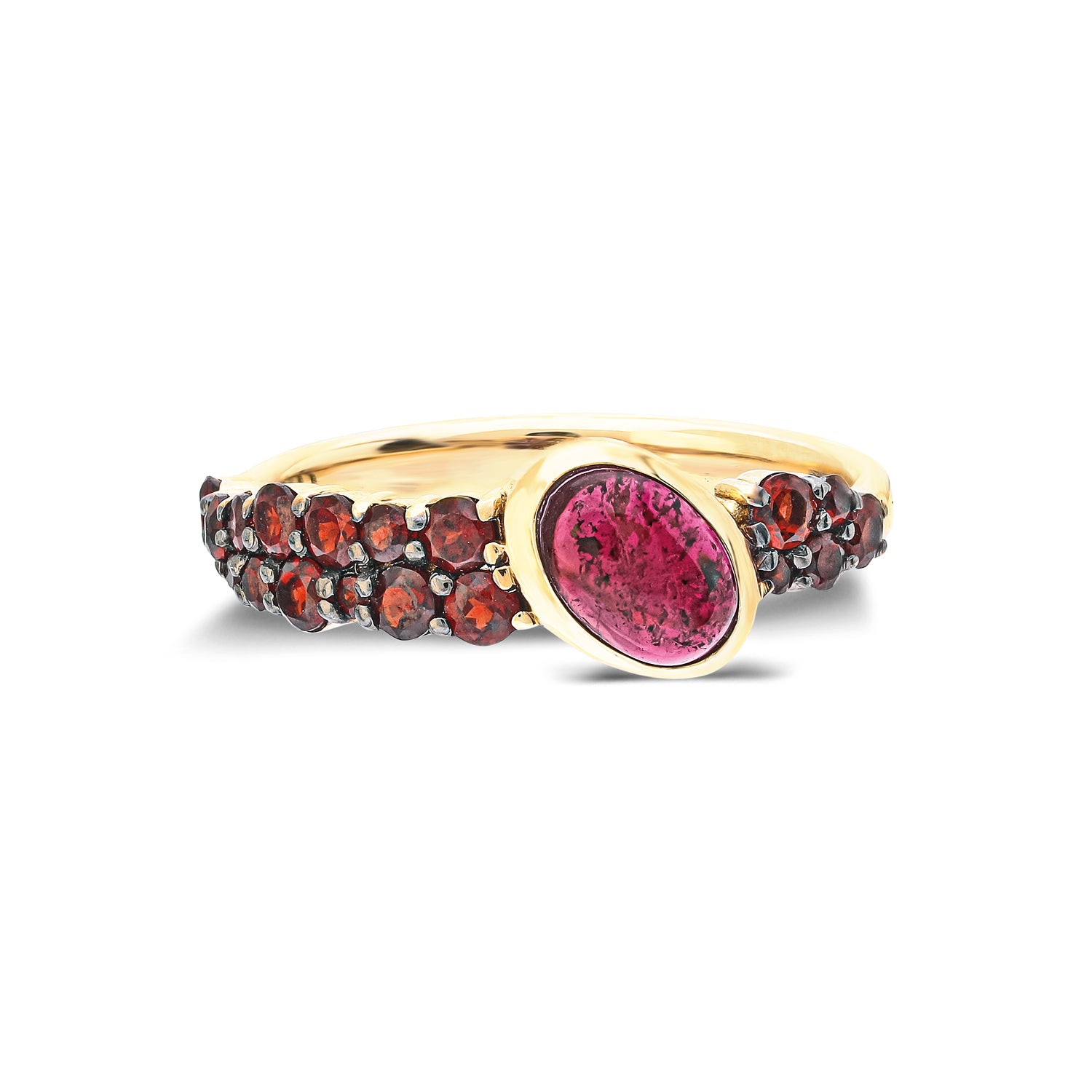 14K Yellow Gold, oval ruby cabochon stone, champagne diamonds