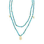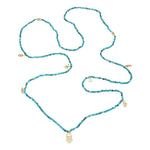 Lovingly named in honor of our first collection Encantada. An enchanting single strand of faceted natural turquoise beads with our İTÄ characters in gold-plated silver delicately positioned throughout: the goddess Atabex, our Caribbean evil eye Mini Macu, our Keko coquí and a Txirimiri swirl. Wear as one long strand or doubled and enjoy them as they catch the light.