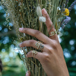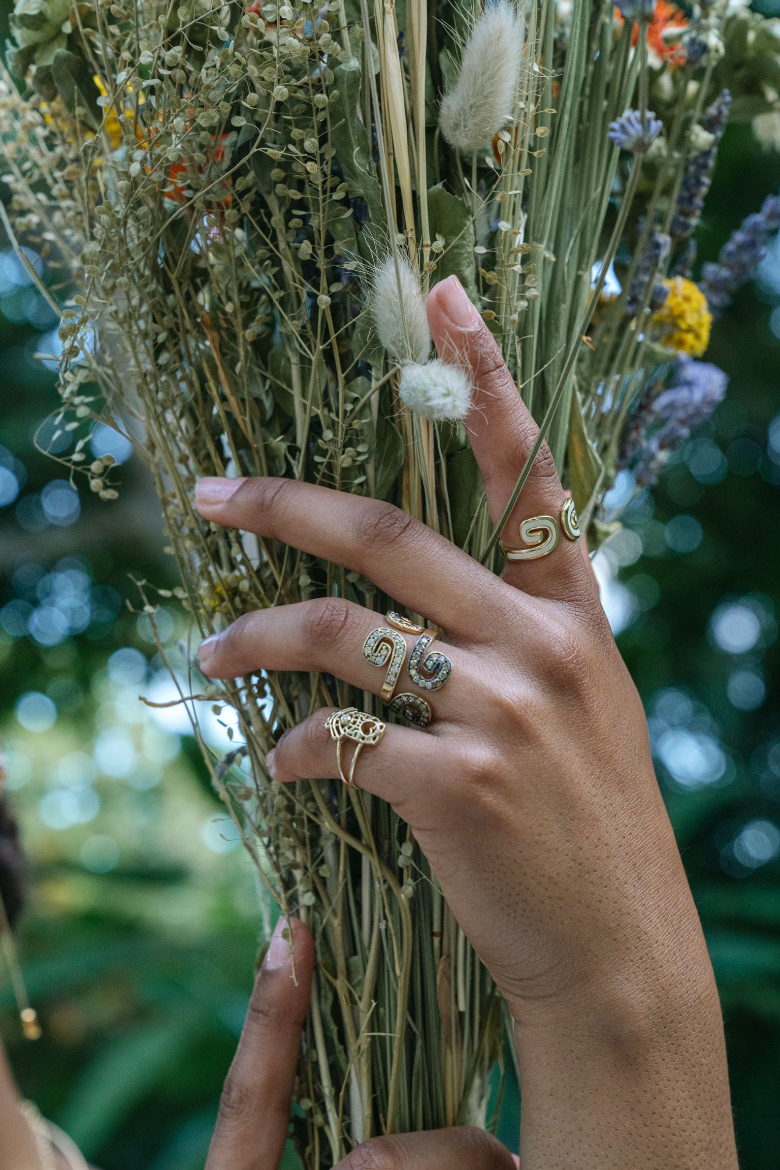 Our beloved Atabex ring is a delicate yet bold statement of womanhood in solid 14K gold with two champagne diamonds. We personally love it as a pinky ring!
