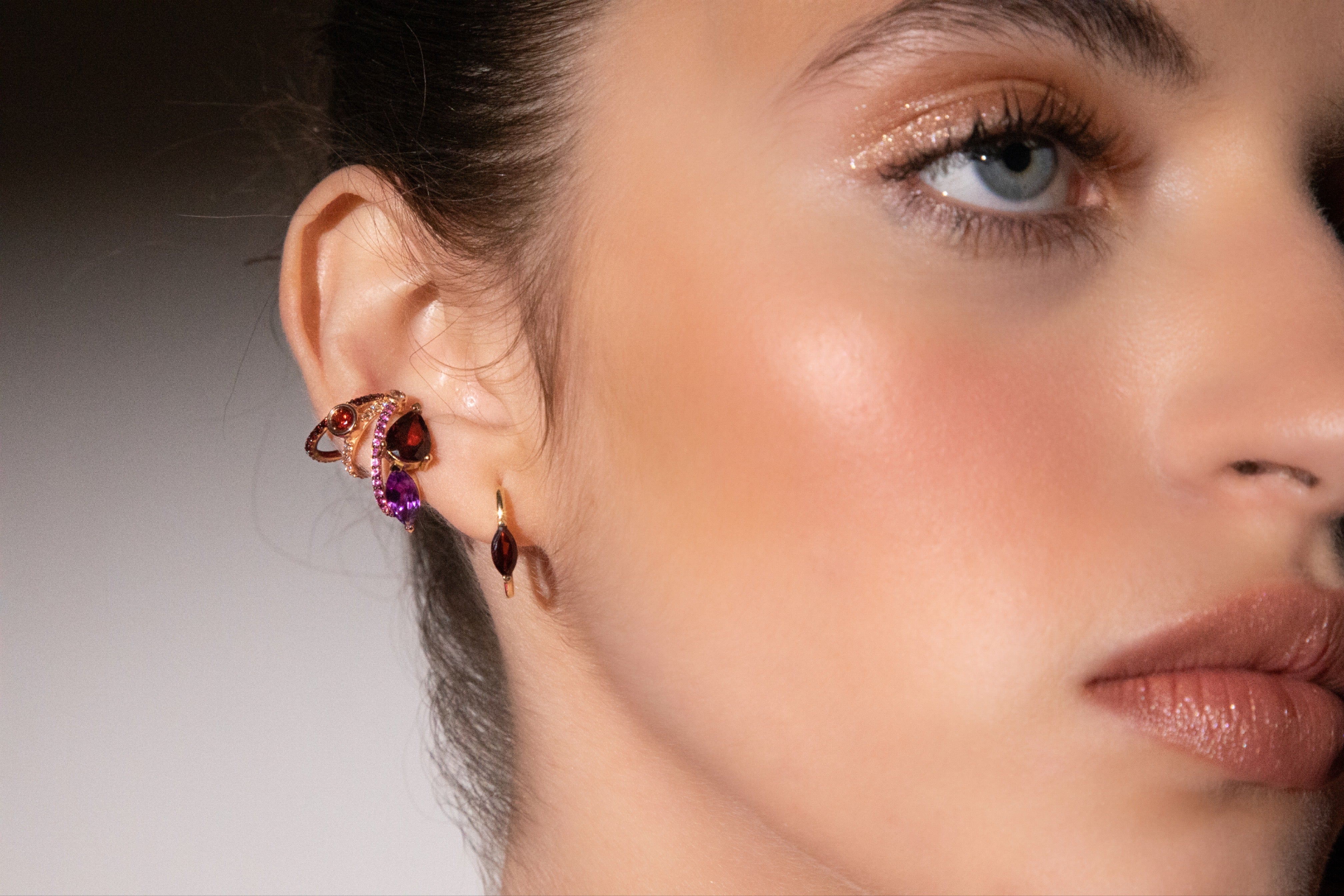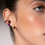 A familiar greeting all over the world. Our “Buenos Días” sun rays make reference to a famous petroglyph our Taíno ancestors left behind. This triple ray ear cuff (no piercing required) lovingly hugs your ear creating multiple levels of inter-dimensional rays in deep red garnets, pink sapphires and champagne diamonds topped off with one brilliant champagne diamond and one deep red garnet.